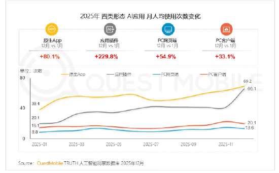 数据印证了插件形态在培养用户习惯上的高效:2025年12月,应用插件的月人均使用次数较1月暴增了229.8%,远高于原生App 80.1%的提升幅度。这表明,在熟悉的既有场景中“顺手调用AI”,正成为高频且稳固的用户习惯。