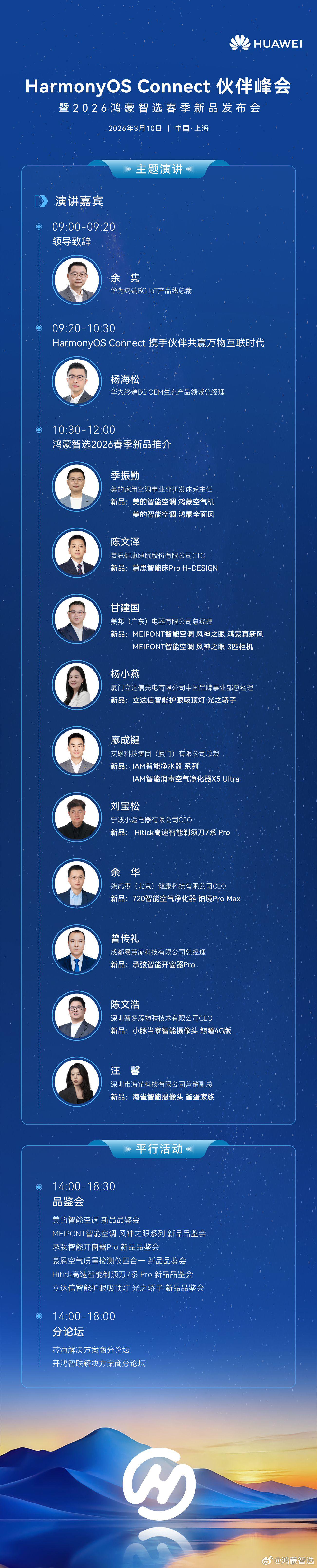 IT之家 3 月 8 日消息,华为终端有限公司鸿蒙智选官方微博宣布,HarmonyOS Connect 伙伴峰会暨鸿蒙智选 2026 年春季新品发布会定档 3 月 10 日在上海举行。